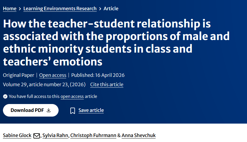 Sabine Glock veröffentlicht gemeinsam mit Sylvia Rahn (BUW, AG Berufsbildungsforschung), Christoph Fuhrmann (BUW, AG Berufsbildungsforschung) und unserer ehemaligen Mitarbeiterin Anna Shevchuk (nun Universität Freiburg) eine neue Studie über den Zusammenhang zwischen der Klassenzusammensetzung im Hinblick auf Geschlecht und Ethnische Minderheiten mit der Lehrkraft-Schüler*innen Beziehung. Hierbei wurde die Lehrkraft-Schüler*innen Beziehung in Berufsschulklassen sowohl aus Sicht der Lehrkräfte als auch der Schüler*innen betrachtet. Die Studie findet, dass die Lehrkraft-Schüler*innen Beziehung in Klassen mit einem höheren Anteil Schüler*innen enthnischer Minderheiten sowohl durch die Lehrkräfte als auch durch die Schüler*innen negativer wahrgenommen wurde, als in Klassen mit einem niedrigeren Anteil Schüler*innen enthnischer Minderheiten. Aus Schüler*innensicht wurde die Lehrkraft-Schüler*innenbeziehung außerdem in Klassen mit einem hohen Anteil Schülerinnen positiver wahrgenommen, als in Klassen mit einem hohen Anteil Schüler.