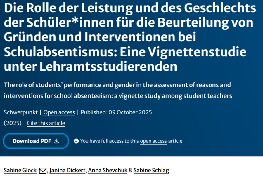 Sabine Glock und Janina Dickert haben gemeinsam mit unserer ehemaligen Mitarbeiterin Anna Shevchuk (jetzt Universität Freiburg) und Sabine Schlag (Arbeitsbereit Professionalisierungsforschung in der Lehrer*innenbildung) einen Artikel zum Thema Geschlechts- und Leistungsstereotypen in der Beurteilung von Gründen und Interventionen bei Schulabsentismus veröffentlicht. Der Artikel ist in der Zeitschrift für Erziehungswissenschaft als open access erschienen und kann hier abgerufen werden.